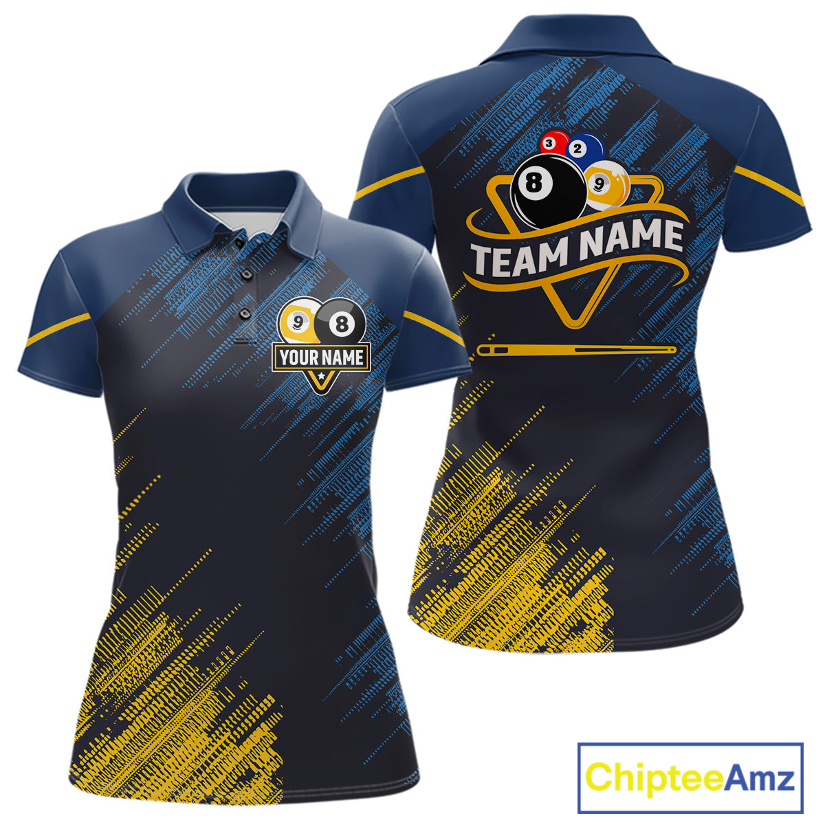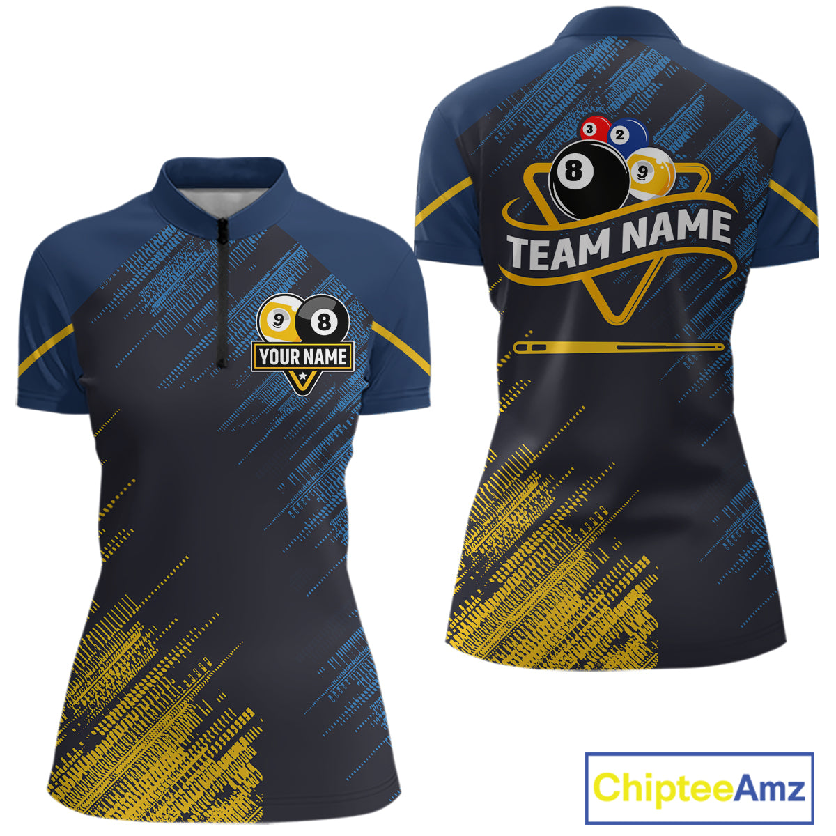 Personalized Blue Yellow 8 Ball & 9 Ball Pool Polo & 1/4 Zip For Women Custom Team Billiard Jersey TDM5745