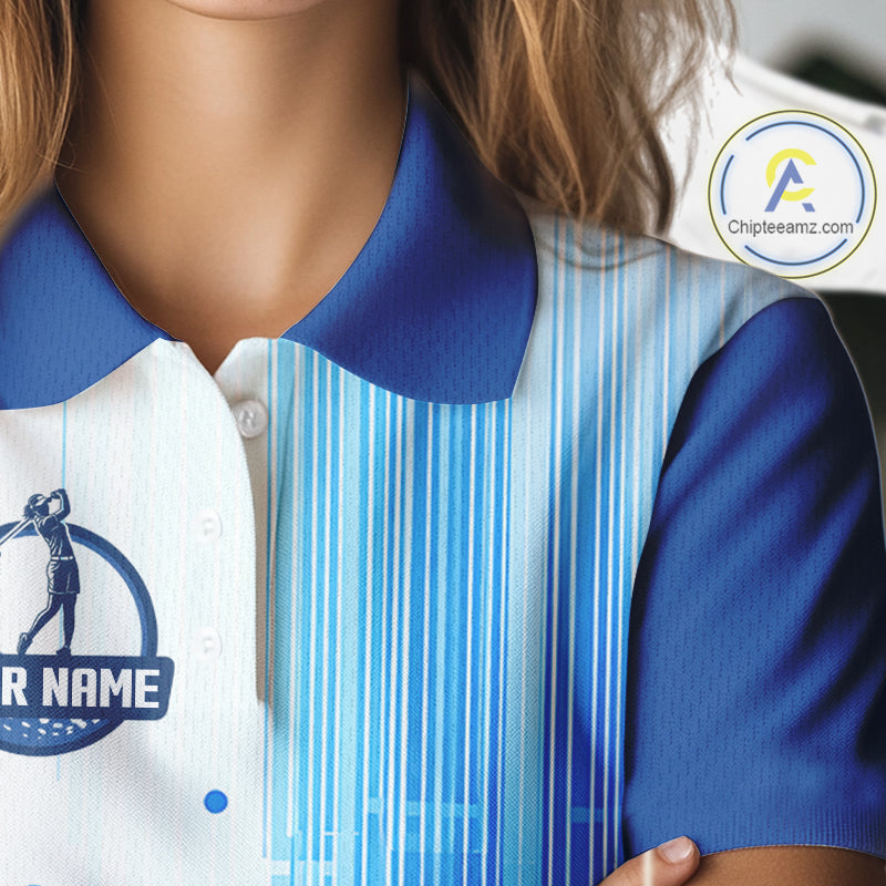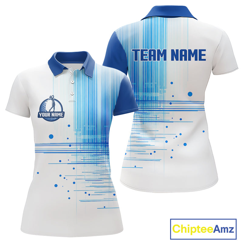 Womens Golf Polo Shirt Custom Blue Pattern Team Golf Tops, White Golf Golf Outfit For Women NHN0087