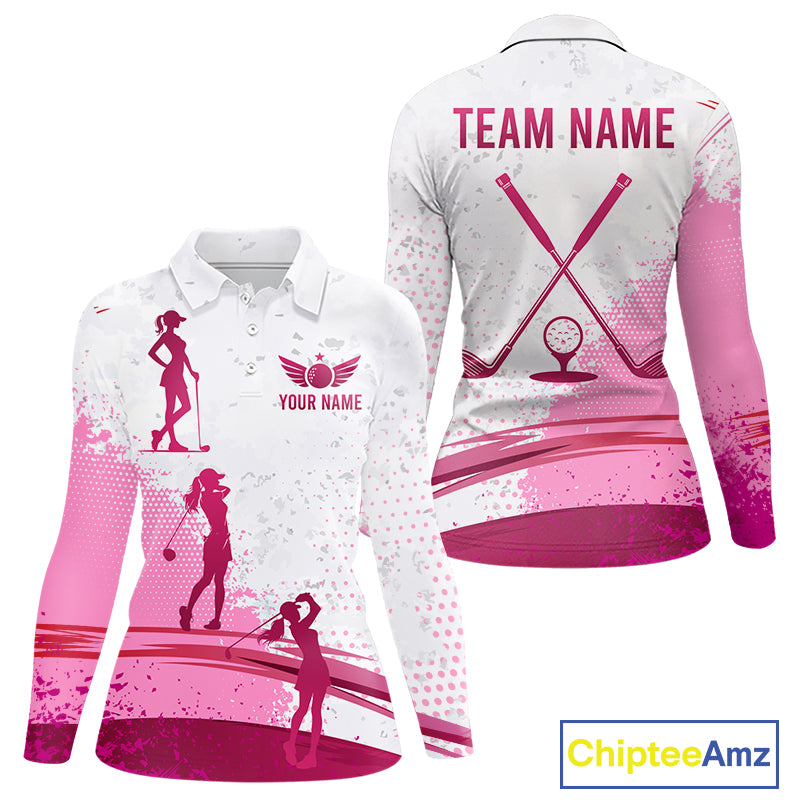 Womens Golf Polo Shirts Pink White Custom Name Long Sleeve Golf Shirts For Women Golf Ball Gifts NHN0037