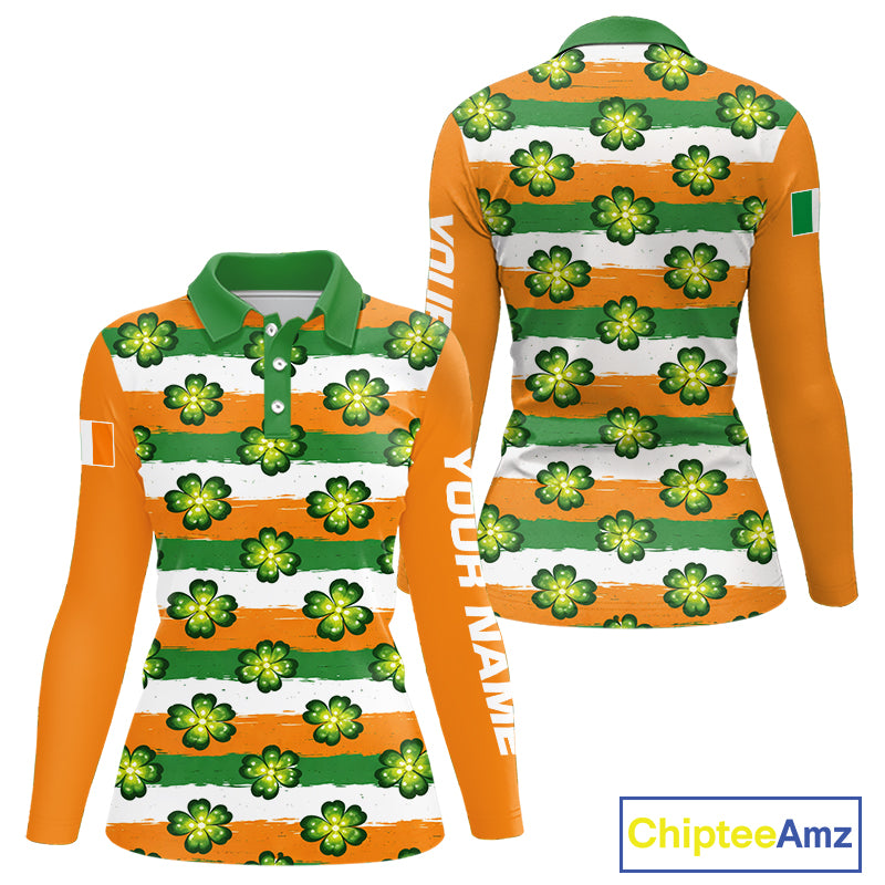 Womens Long Sleeve Golf Polo Shirt Custom Green Clover St Patricks Day Pattern Ireland Flag Golf Shirt NHN0138