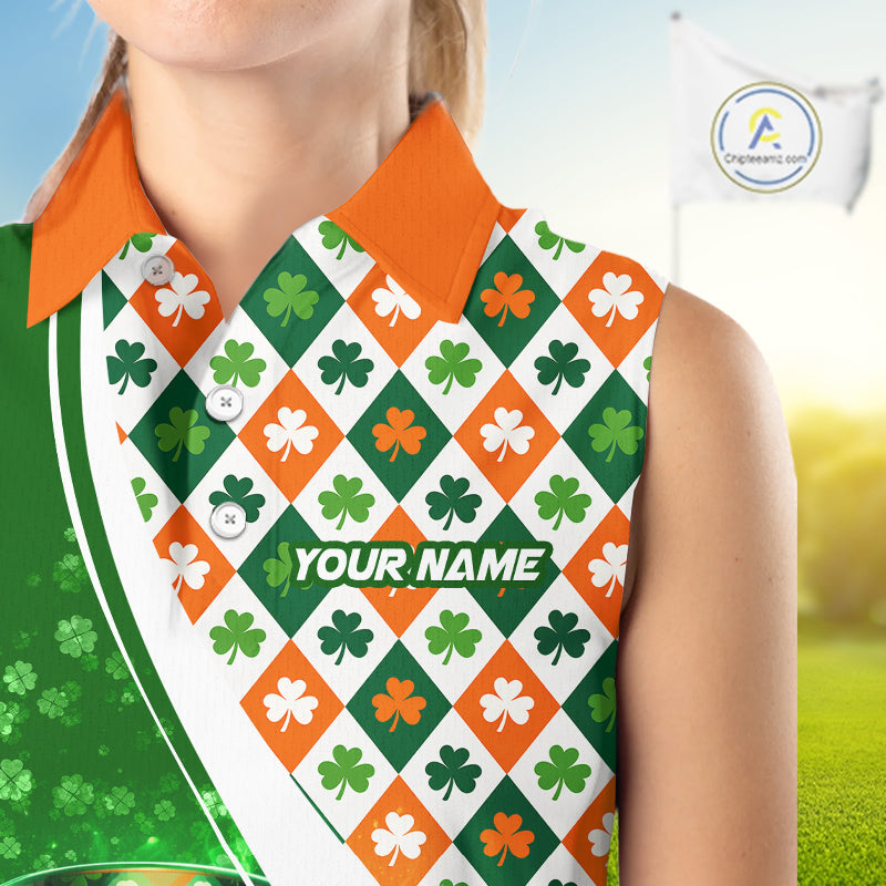 Womens Sleeveless Golf Polo Shirt Custom Green Clover St Patricks Day Plaid Pattern Ireland Flag NHN0142