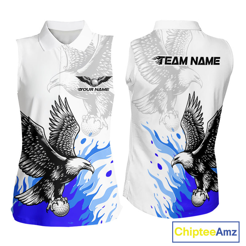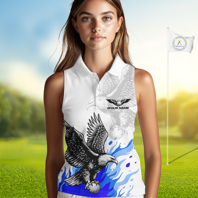 Womens Sleeveless Golf Polo Shirtt Custom Eagle Blue Flame Golf Tops, White Golf Outfit NHN0070
